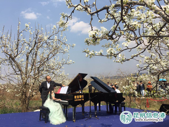 ????昆明信息港訊 記者楊炎 3月17日,正值梨花盛開之時(shí),以“花都情,萬溪緣,梨花香”為主題的呈貢第五屆萬溪梨花節(jié)系列活動之梨花音樂會在萬溪沖梨園舉行,為到萬溪沖休閑的游客帶來了精彩的鋼琴演出。