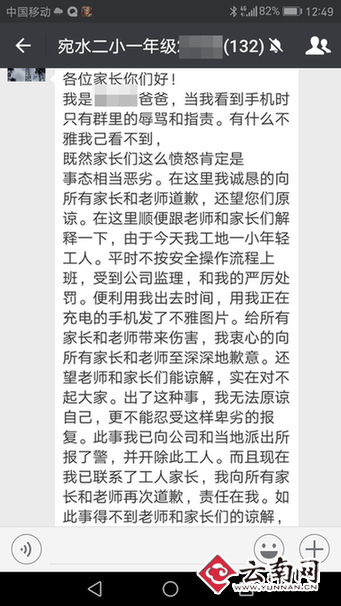 ????當(dāng)天晚上21時(shí)12分,發(fā)布不雅視頻的學(xué)生家長在群內(nèi)發(fā)布了一段文字,稱當(dāng)他看見手機(jī)的時(shí)候,群里只有辱罵和指責(zé),而不雅內(nèi)容自己已經(jīng)看不到,他進(jìn)一步解釋說由于工地一名小年輕工人平時(shí)不按安全操作流程上班,受到公司的監(jiān)理和他的嚴(yán)厲處罰后,趁其外出時(shí),用正在充電的手機(jī)發(fā)布了不雅內(nèi)容到學(xué)生家長群?!俺隽诉@種事,我無法原諒自己,更不能忍受這種卑劣的報(bào)復(fù)”他說,關(guān)于此事已經(jīng)向公司和當(dāng)?shù)鼐綀?bào)警,并開除此工人。