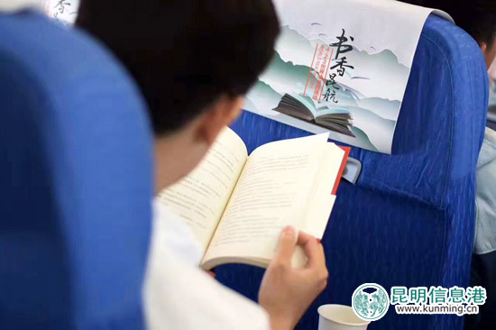 ????登上昆航機(jī)艙,書吧一般的現(xiàn)場布置、身著旗袍的昆航“阿詩瑪”乘務(wù)員、伴著音樂的聲聲朗誦……整個(gè)航站樓變成了書香彌漫的圖書館。