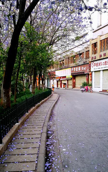 ????在北市區(qū)紅錦路片區(qū),藍(lán)花楹不僅整條路上都有,而且周邊諸如荷塘月色、月牙塘公園、云南省財(cái)經(jīng)學(xué)院內(nèi)都有藍(lán)花楹種植。在這一片區(qū),市民可直接將車停在附近,漫步在人行道上、或者進(jìn)入小區(qū)里找個(gè)休息椅坐下來(lái),靜靜享受這一方靜好。