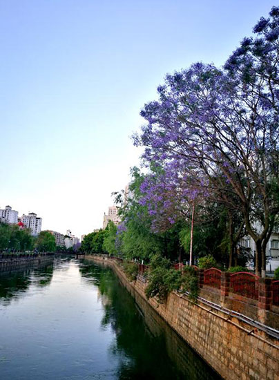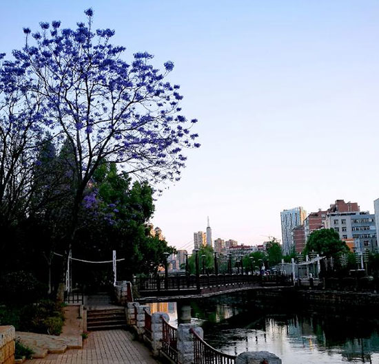 ????盤龍江邊的藍(lán)花楹以油管橋到敷潤(rùn)橋?yàn)楸?,栽種了1至3排約數(shù)百株藍(lán)花楹,猶如一條紫色的絲帶,裝點(diǎn)于盤龍江岸。每到初夏,整個(gè)江岸一片紫藍(lán)色,和江水的景色融在一起,再加上綠色的楊柳,浪漫、夢(mèng)幻中又透著勃勃生機(jī)。