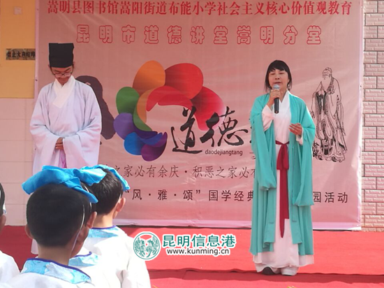 ????“讀一本經(jīng)典書籍、誦一首經(jīng)典詩詞、吟一曲經(jīng)典歌曲……”本期道德講堂的活動(dòng)流程中,充滿了字字珠璣的經(jīng)典詩文,在身著古裝的師生們身上呈現(xiàn)出中華禮儀的韻味。孩子們脫稿誦讀《三字經(jīng)》、《千字文》、《弟子規(guī)》,教師們誦讀《春江花月夜》,書香溢滿校園,現(xiàn)場(chǎng)工作人員忍不住跟著一起誦讀,文化的魅力柔軟而富有滲透性。聽布能小學(xué)校長(zhǎng)李麗香老師介紹,除了必修課,這些經(jīng)典國學(xué)孩子們已經(jīng)學(xué)習(xí)了近三年了,所以背誦起來沒有問題。作為教育工作者,她反對(duì)“拔苗助長(zhǎng)”的教育方式,認(rèn)為文化與禮儀應(yīng)該點(diǎn)點(diǎn)滴滴的滲透到孩子的思想與行為里,讓“溫良恭儉讓,仁義禮智信”這樣的傳統(tǒng)美德融入一個(gè)受教育者的血脈。從事過心理咨詢師的她,懂得把校園環(huán)境建設(shè)得像花園一般,食堂的飯菜可口美味,她想通過點(diǎn)滴美好,留住孩子的心,讓孩子在這個(gè)“有趣”的地方綻放成一朵朵美麗的花。