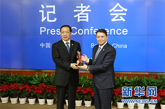 ????國(guó)家旅游局局長(zhǎng)李金早向聯(lián)合國(guó)世界旅游組織秘書長(zhǎng)瑞法依贈(zèng)送禮物。新華網(wǎng) 薛楓/攝