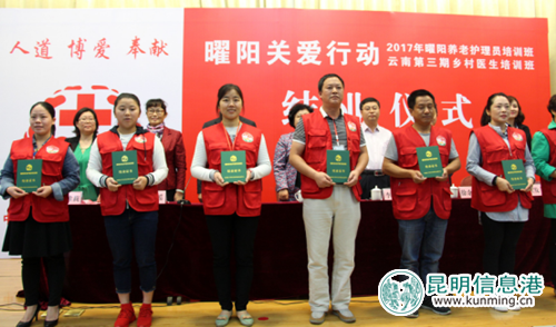 ????昆明信息港訊 記者張子源 5月25日,曜陽(yáng)關(guān)愛(ài)行動(dòng)2017年曜陽(yáng)養(yǎng)老護(hù)理員培訓(xùn)班(以下簡(jiǎn)稱“護(hù)理培訓(xùn)班”)和云南第三期鄉(xiāng)村醫(yī)生培訓(xùn)班(以下簡(jiǎn)稱“鄉(xiāng)醫(yī)培訓(xùn)班”)同時(shí)在云南昆明舉行結(jié)業(yè)典禮。本次護(hù)理培訓(xùn)班對(duì)來(lái)自云南、廣西、貴州的130名一線養(yǎng)老機(jī)構(gòu)護(hù)理人員進(jìn)行了10天的系統(tǒng)培訓(xùn);鄉(xiāng)醫(yī)培訓(xùn)班對(duì)來(lái)自云南16個(gè)地州拉祜族、傈僳族、佤族等12個(gè)少數(shù)民族的104名鄉(xiāng)村醫(yī)生進(jìn)行了15天的全科培訓(xùn)。