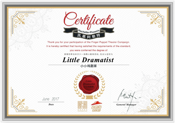 ????此外,參加必勝客指偶視頻分享活動的親子家庭,將有機(jī)會獲得阿歇特和必勝客聯(lián)合發(fā)布的“小小戲劇家”證書。您可以將表演視頻上傳到新浪微博,加話題榜#必勝客指偶小劇場#,同時@必勝客歡樂餐廳 @鳳凰阿歇特,分享獨(dú)一無二的指偶戲劇體驗!(具體活動規(guī)則詳見必勝客歡樂餐廳官方微博活動通知)