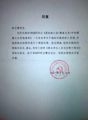 ????2016年3月29日,趙藝懋就李副教授剽竊一事向云南師范大學(xué)紀(jì)委進(jìn)行舉報(bào)。接到舉報(bào)后,云南師范大學(xué)對(duì)此事進(jìn)行調(diào)查。2017年3月10日,趙藝懋得到了云南師范大學(xué)紀(jì)委的書面回復(fù)。