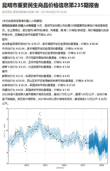 ????作為新入職的實習(xí)記者,“小明”重點關(guān)注的是昆明人的衣食住行。通過海量的數(shù)據(jù)和高效的算法,現(xiàn)在可以獨立完成民生服務(wù)(停水停電通知、實時路況、天氣預(yù)警、民生菜價等)、演出活動及部分行業(yè)的新聞稿件。