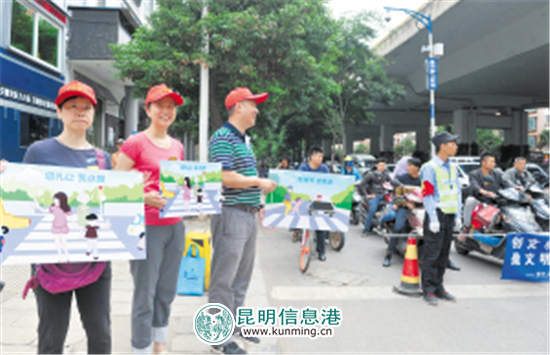 志愿者在路口倡導(dǎo)交通文明。昆明日報記者劉凱達(dá)/攝