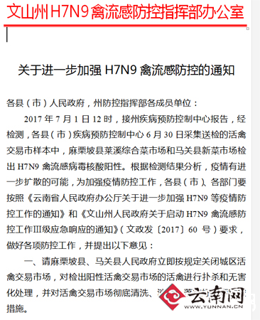 ????7月1日晚間,記者從中共文山州委宣傳部獲悉,文山州H7N9禽流感防控指揮部辦公室發(fā)布通知稱,在麻栗坡縣萊溪綜合菜市場和馬關(guān)縣新菜市場檢出H7N9禽流感病毒核酸陽性,疫情有進一步擴散的可能。下一步兩縣將對檢出H7N9陽性活禽交易市場的活禽進行撲殺和無害化處理。