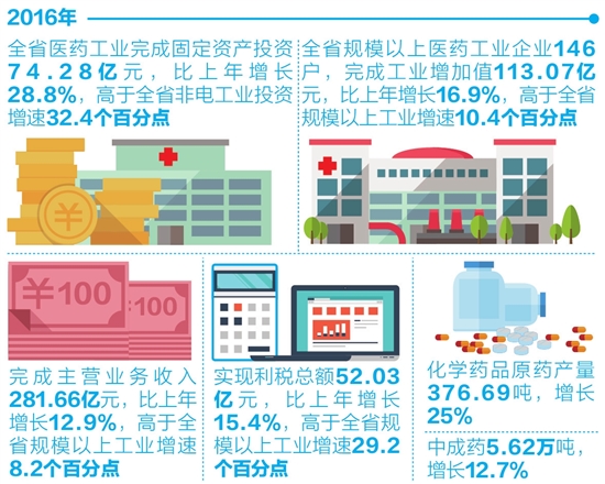 ????記者從省工信委獲悉,2016年,全省醫(yī)藥工業(yè)穩(wěn)中有進(jìn)、穩(wěn)中向好,實(shí)現(xiàn)了“十三五”良好開(kāi)局,全省規(guī)模以上醫(yī)藥工業(yè)企業(yè)146戶(hù),完成工業(yè)增加值113.07億元,比上年增長(zhǎng)16.9%,高于全省規(guī)模以上工業(yè)增速10.4個(gè)百分點(diǎn);完成主營(yíng)業(yè)務(wù)收入281.66億元,比上年增長(zhǎng)12.9%,高于全省規(guī)模以上工業(yè)增速8.2個(gè)百分點(diǎn);實(shí)現(xiàn)利稅總額52.03億元,比上年增長(zhǎng)15.4%,高于全省規(guī)模以上工業(yè)增速29.2個(gè)百分點(diǎn)。化學(xué)藥品原藥產(chǎn)量376.69噸,增長(zhǎng)25%;中成藥5.62萬(wàn)噸,增長(zhǎng)12.7%。