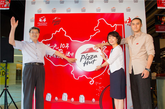????今年,“捐一元”十周年募捐活動(dòng)7月8日正式啟動(dòng)之前,必勝客在上海的餐廳舉辦了“捐一元十年·傳遞愛的滋味”動(dòng)員儀式,鼓舞廣大員工在十年之際不忘初心,再接再厲積極募款。中國扶貧基金會(huì)副會(huì)長江紹高、中國扶貧基金會(huì)母嬰部主任問會(huì)芳、必勝客企劃副總裁鐘芳華、必勝客營運(yùn)資深總監(jiān)蔣勤以及必勝客華東市場總經(jīng)理姚彬出席了動(dòng)員儀式。一直熱心公益的國內(nèi)一線小生蔣勁夫,也以“捐一元項(xiàng)目愛心大使”的身份來到現(xiàn)場,號(hào)召更多人參與到公益行動(dòng)中,為貧困地區(qū)的孩子獻(xiàn)出一份愛心。