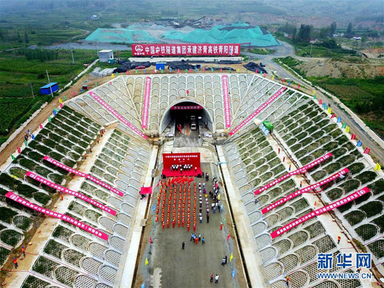 ??? 7月16日航拍的濟(jì)青高鐵青陽隧道進(jìn)口。當(dāng)日,中鐵隧道集團(tuán)濟(jì)青高鐵青陽隧道勝利貫通慶祝儀式在青陽隧道進(jìn)口舉行。