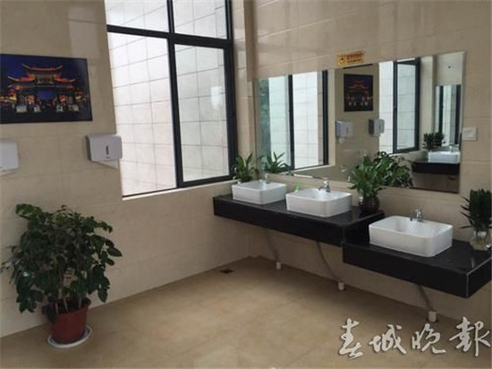 ????除了公廁必備的硬件外,這座目前昆明最大的公廁,在軟件上也下了一番功夫,按照凈化、綠化、美化的標(biāo)準(zhǔn)進(jìn)行了設(shè)計。包括官渡古鎮(zhèn)在內(nèi)的一些“官渡元素”,都出現(xiàn)在了墻面的裝飾上。在公廁內(nèi)還配置了免費的衛(wèi)生紙、洗手液、風(fēng)干機(jī)和大量綠植。值得注意的是,公廁配備了第三衛(wèi)生間,除了殘疾人專用的衛(wèi)生間外,還根據(jù)老人、小孩的不同特征,設(shè)置了扶手、防滑地面、兒童坐便器等設(shè)施。同時,還專門開辟了一間“愛心驛站”,為城市環(huán)衛(wèi)工人提供免費的休息場所。