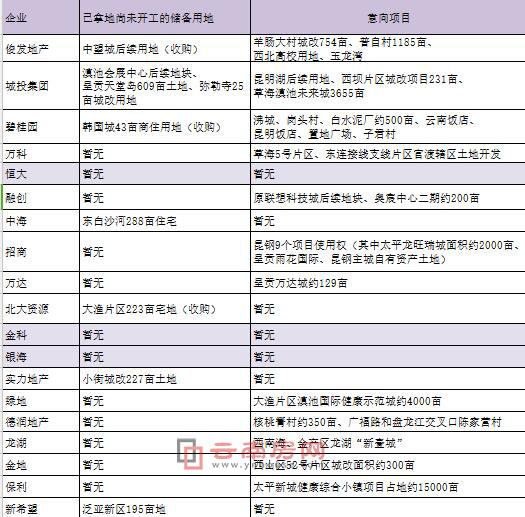 ????除了以上有存糧的房企外,昆明大部分房企手中已沒有嚴(yán)格意義上的土地儲備,包括一線的萬科、恒大、保利、招商、綠地、金科等,就目前公開的情況來看,有些大房企不僅沒有存地,連意向接盤或簽約合作的項(xiàng)目都沒有,只有靠著目前在開發(fā)項(xiàng)目“維持生計”。
