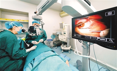 “行知中國”助力關(guān)愛西部青少年眼健康。圖為蘭州普瑞眼科醫(yī)院醫(yī)生在手術(shù)室為高三學(xué)生羅進(jìn)榮實(shí)施眼科手術(shù)。 |
