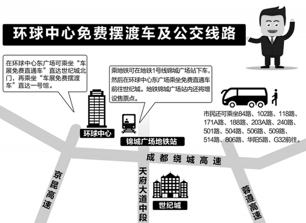 對(duì)于自駕前往的市民,請(qǐng)注意繞城高速錦城湖出口、天府大道沿線(xiàn)等多個(gè)路段都設(shè)有交通指示牌,引導(dǎo)私家車(chē)駛?cè)氕h(huán)球中心停車(chē)場(chǎng)。在環(huán)球中心東廣場(chǎng)可乘坐“車(chē)展免費(fèi)直通車(chē)”直達(dá)世紀(jì)城北門(mén),再乘坐“車(chē)展免費(fèi)擺渡車(chē)”直達(dá)一號(hào)館。