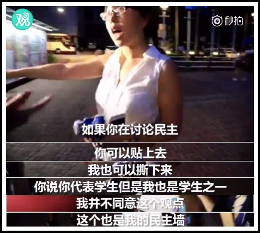 ????9月5日晚上,一名在港就讀的內(nèi)地女生撕下海報(bào)后,被蹲點(diǎn)的記者和“港獨(dú)”學(xué)生圍住,但她沒有露怯,反而與之激辯民主,怒斥港中大學(xué)生會(huì)張貼“港獨(dú)”海報(bào)的所作所為。