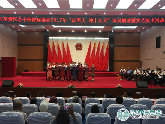 ????昆明信息港訊 記者楊炎 9月13日,昆明市呈貢區(qū)老干部詩詞協(xié)會舉行“慶國慶 迎十九大”詩詞朗誦及文藝演出活動,旨在用“小活動”傳播“大價值”,用“精氣神”弘揚(yáng)“真善美”,集聚正能量,以實際行動喜迎黨的十九大勝利召開。
