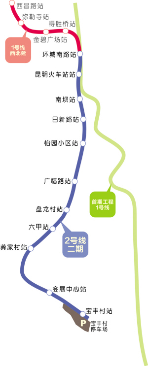 ????地鐵2號(hào)線二期工程起于環(huán)城南路站南端頭井,沿北京路向南下穿昆明火車站、南二環(huán)高架進(jìn)入官南大道,沿道路向南敷設(shè)。工程設(shè)計(jì)范圍為環(huán)城南路站(不含)至寶豐村站,沿途共設(shè)昆明火車站站、南壩站、日新路站、怡園小區(qū)站、廣福路站、盤龍村站、六甲站、龔家村站、會(huì)展中心站、寶豐村站10座車站,均為地下站。2號(hào)線二期工程于寶豐村設(shè)停車場一處(與5、8號(hào)線共用),同時(shí)將首期工程中已運(yùn)營的停車場,即嚴(yán)家山車輛段,擴(kuò)建為定修級(jí)車輛段。