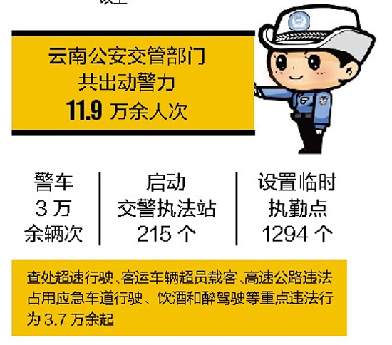 ????查處超速行駛、客運車輛超員載客、高速公路違法占用應(yīng)急車道行駛、飲酒和醉駕駛等重點違法行為3.7萬余起。1日至7日,在云南全省高速公路收費站、服務(wù)區(qū)和旅游景區(qū)主干道上設(shè)置臨時快處快賠服務(wù)點118個,共處理1753起簡易事故,共接報適用一般程序處理的道路交通事故151起。