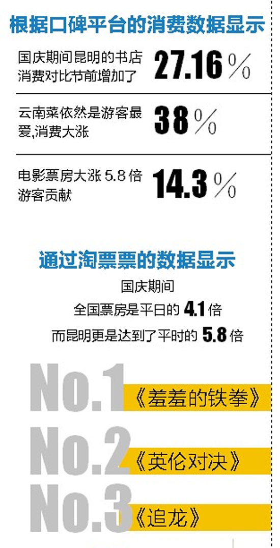 ????昆明信息港訊(都市時報 記者程浩 黃朝紅 吳雙紅 李文璟 張小燕 趙倩 通訊員徐彥) 8天長假收官,相關(guān)統(tǒng)計數(shù)據(jù)顯示,居民的消費熱情空前高漲。昆明,作為全國最熱門的旅游城市之一,旅游經(jīng)濟所拉動的消費漲幅顯著。