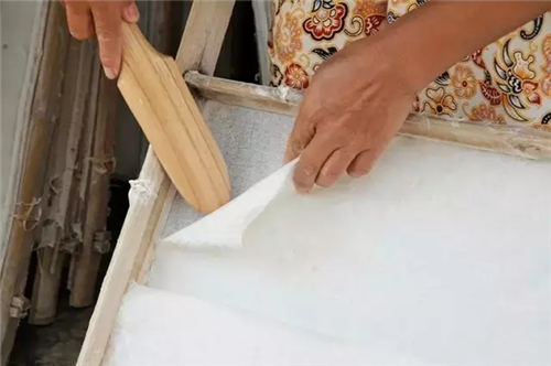 ????紙曬干后,先用手撕開一個角,然后就用很光滑的揭紙木刀輕輕滑動將紙和紗布分開、揭下整張紙。紙揭下后就按需要折疊打捆。