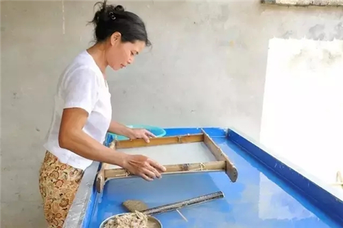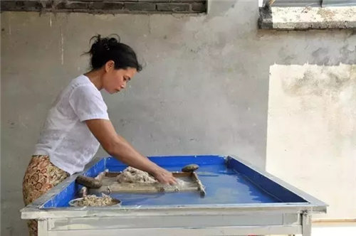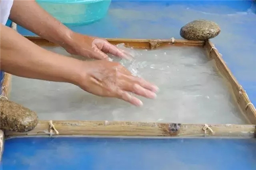 ????先在紙床里盛上七分滿的清水,然后將紙模放入紙床里的水中用石塊固定,再將適當(dāng)份量的漿撒在紙模里。放入紙模里的紙漿量多少全靠個人經(jīng)驗。先用雙手攪開紙漿,再用棒均勻拍打,待紙漿均勻沉淀到白紗布上后再移動石塊,慢慢傾斜著豎起紙模,讓水濾干后再到陽光下曬干。