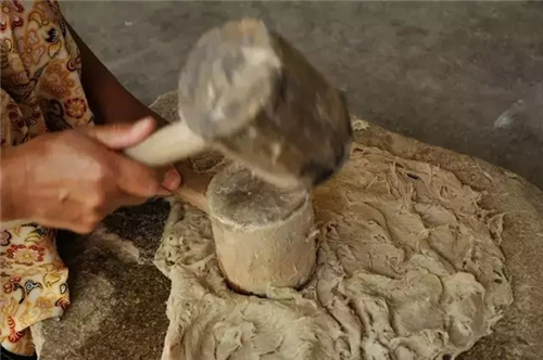 ????將清洗干凈的構(gòu)皮置于石墩上,用酸角樹制成的木錘反復(fù)捶打上百次,直到將構(gòu)皮捶打成能夠在水中自然散開的纖維為止。