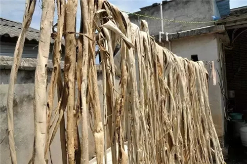 ????采好的鮮料不能直接煮,否則造出的紙不白。必須將采剝來的構(gòu)樹皮掛在太陽下暴曬,曬干后儲存?zhèn)溆谩?/p>