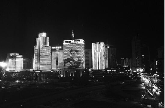 ????剛剛過去不久的國慶長假期間,可能不少市民已經(jīng)留意到,每當(dāng)夜幕降臨,東風(fēng)廣場附近的邦克大廈、天恒大酒店、志遠(yuǎn)大廈、華一廣場4棟一字排列的高樓外墻,化身成了一個巨大的熒幕。熒幕上,滾動播放著不同主題的畫面。時而是行走在茶馬古道的馬幫,時而是鄭和下西洋時千帆競發(fā)的畫面;還有藍(lán)天下飄揚的五星紅旗,以及“厲害了,我的國”這樣時下最接地氣的網(wǎng)絡(luò)用語。