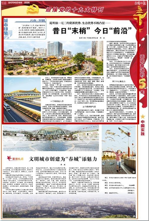 ????10月13日,經(jīng)濟(jì)日?qǐng)?bào)推出迎接黨的十九大特刊,用一個(gè)整版推出《昆明獨(dú)一無(wú)二的資源優(yōu)勢(shì)、生態(tài)優(yōu)勢(shì)不斷凸顯——昔日“末梢” 今日“前沿”》的報(bào)道點(diǎn)贊昆明。報(bào)道從昆明的資源優(yōu)勢(shì)、交通、經(jīng)濟(jì)和文化等方面進(jìn)行剖析,點(diǎn)出昆明如何從昔日“末梢”變今日“前沿”,肯定了昆明的發(fā)展。