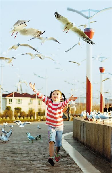 在昆明滇池海埂大壩上與海鷗嬉戲的女孩