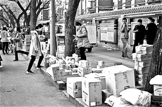近日的北京大學南門外,滿是堆積成小山的“快遞”。供圖/視覺中國