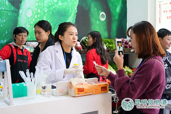 ????國資商城展廳為了讓市民對綠色、健康農(nóng)業(yè)、農(nóng)產(chǎn)品有一個更為直觀、深刻的了解,不僅展示了其傾力打造的“智慧農(nóng)業(yè)”大數(shù)據(jù)平臺,在現(xiàn)場準備了尼西雞、藏香豬肉等高原特色農(nóng)產(chǎn)品的免費試吃活動,還在其展位放置了三臺專業(yè)檢測設備,對其展出的相關(guān)產(chǎn)品進行現(xiàn)場檢測。