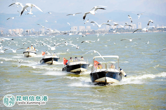 漁政處工作人員在滇池上巡邏檢查。記者杜文蕾/攝
