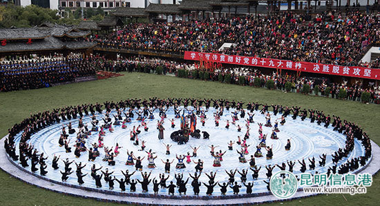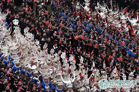 ????昆明信息港訊 記者楊雨發(fā)自貴州 11月23日,貴州省黔東南苗族侗族自治州雷山縣迎來了一年一度最隆重的苗族傳統(tǒng)節(jié)日“苗年”,上萬名苗族同胞身著節(jié)日盛裝載歌載舞,集中展示苗族的銀飾、刺繡和歌舞等非物質文化遺產。苗年于2008年被列入第二批國家級非物質文化遺產保護名錄。