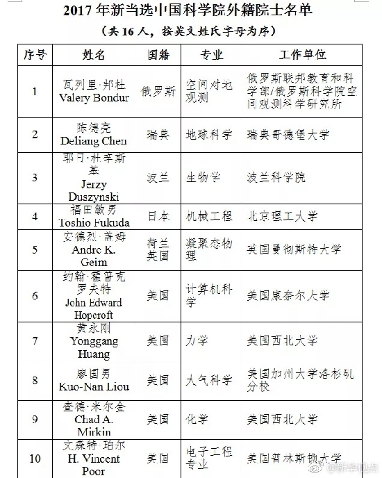 ????另外,16人新當(dāng)選為中科院外籍院士,其中有2位諾貝爾獎(jiǎng)獲得者。