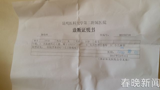 ????葉琴說,來到昆明醫(yī)科大學(xué)第二附屬醫(yī)院經(jīng)過醫(yī)生檢查,由于妹妹的右手嚴(yán)重?zé)齻?,醫(yī)生說要截肢。