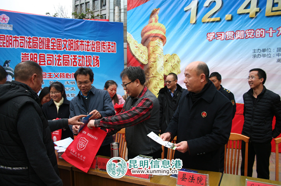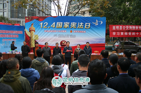 ????昆明信息港訊 為切實(shí)做好“12·4”國(guó)家憲法日宣傳活動(dòng),全面提高國(guó)家憲法日在群眾中的知曉率,12月4日,由昆明市司法局、昆明市普法辦主辦、嵩明縣委依法治縣辦、縣司法局、縣普法辦、縣法學(xué)會(huì)承辦,全縣17家成員單位在嵩明縣嵩陽街道開展以“學(xué)習(xí)貫徹黨的十九大精神,維護(hù)憲法權(quán)威”為主題的2017年國(guó)家憲法日暨法治宣傳月活動(dòng)。