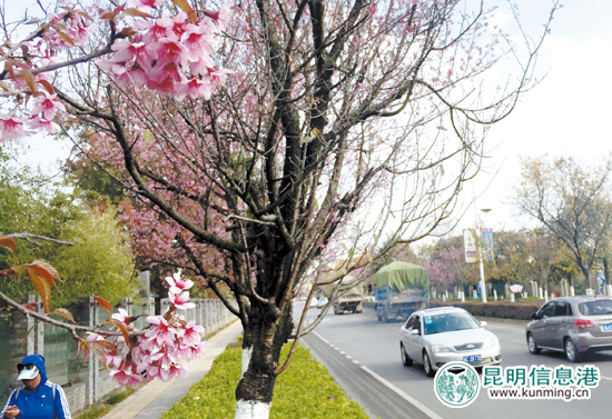 ????“昆明街頭的冬櫻花開花了,一片一片真美?!弊罱?,不少細(xì)心的市民發(fā)現(xiàn),在紅塔西路長達(dá)1.9公里的道路兩側(cè),600余株冬櫻花已經(jīng)陸續(xù)開放。這些冬櫻花樹的樹齡都超過20年,每當(dāng)冬櫻花盛開,一樹一樹繁花似錦,一枝一枝花團(tuán)錦簇,美不勝收。昆明信息港訊(昆明日報(bào) 記者趙偉/攝)