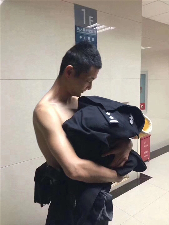 ????民警吳宇脫下警服,光著上身給孩子取暖