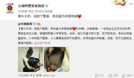????“央視新聞”微博,也關(guān)注了這條新聞,其中說(shuō):“寒冷冬夜,他脫下警服,用體溫為棄嬰取暖?!边@條微博,又為“云南網(wǎng)警巡查執(zhí)法”轉(zhuǎn)發(fā)。