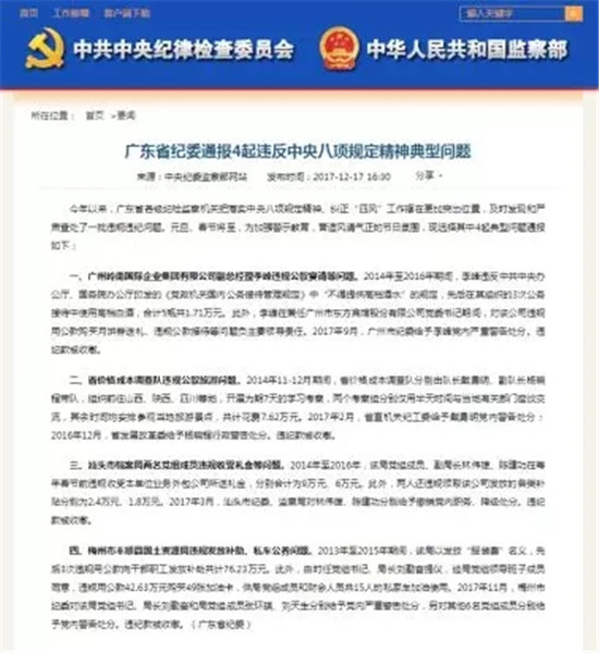 廣東省紀(jì)委通報(bào)4起違反中央八項(xiàng)規(guī)定精神典型問題