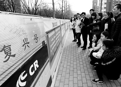 山東青年政治學(xué)院師生觀看“復(fù)興號(hào)”十九大精神展板。資料圖片