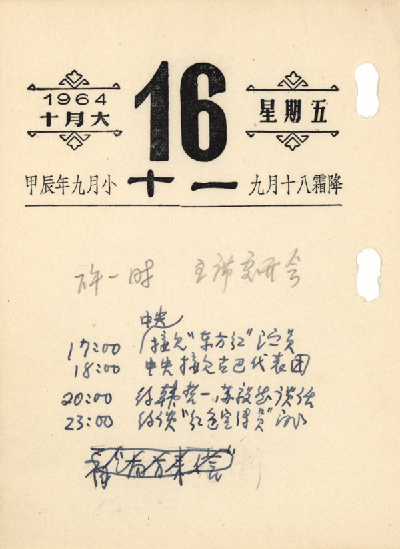 ????1964年10月16日,周總理工作臺歷上密密麻麻的安排一直持續(xù)到晚上11點(diǎn)。正是這一天,在人民大會堂,周總理莊嚴(yán)宣告:“我們國家第一顆原子彈爆炸成功了!”
