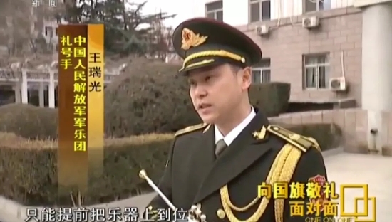 ??? 在升旗現(xiàn)場(chǎng),對(duì)“向國(guó)旗敬禮”口令感受格外深刻的還有解放軍軍樂(lè)團(tuán)副團(tuán)長(zhǎng)兼指揮張海峰。按照程序,“向國(guó)旗敬禮”口令下達(dá)之后,升旗手按下升旗按鈕,同時(shí)張海峰開(kāi)始指揮軍樂(lè)團(tuán)演奏國(guó)歌,這樣才能確保國(guó)旗在46秒國(guó)歌演奏的時(shí)間內(nèi)成功升起。