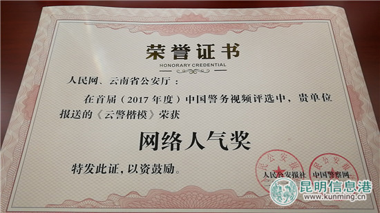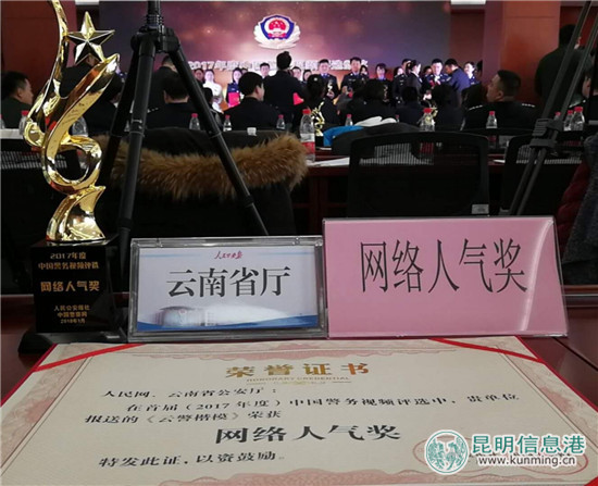 ????昆明信息港訊 記者合宇聰 1月12日,由人民公安報(bào)、中國(guó)警察網(wǎng)舉辦的2017年度中國(guó)警務(wù)視頻發(fā)展研討會(huì)在北京舉行,云南省公安廳和人民網(wǎng)聯(lián)合策劃制作的“致敬 云警楷?!毕盗幸曨l榮獲2017年度全國(guó)警務(wù)視頻“網(wǎng)絡(luò)人氣獎(jiǎng)”。