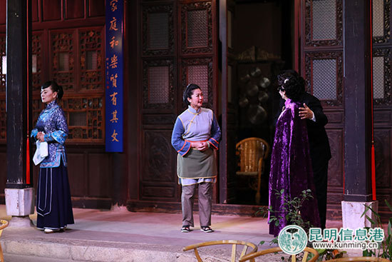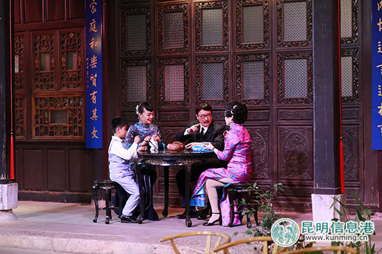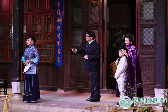 發(fā)布會現(xiàn)場表演的片段,人物造型精致,劇情沖突激烈,對白富有韻味且飽含昆明元素,馬家大院的四合院造型,在夜色和舞美燈光的配合下更讓觀眾有在四維空間看戲的真實和震撼。