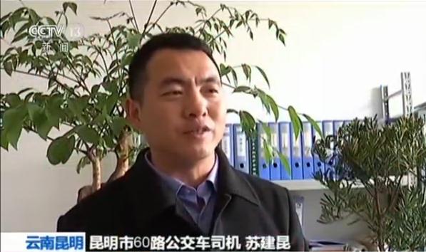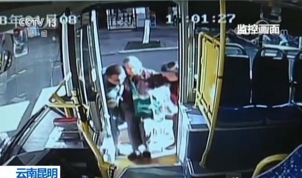 ????監(jiān)控畫面顯示,1月8日下午三點(diǎn)左右,蘇建昆駕駛昆明市60路公交車到達(dá)一站臺后,在等候乘客上下車時,發(fā)現(xiàn)了一名杵著拐杖的老人上車十分費(fèi)勁。蘇師傅停好車后,趕緊解開安全帶下車去幫忙,將老人抱上了車。