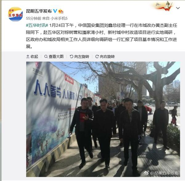 ????五華區(qū)官方微博“昆明五華發(fā)布”近日發(fā)布消息稱:“1月24日,中信國安集團劉鑫總經理一行在市城改辦黃杰副主任陪同下,赴五華區(qū)對棕樹營和潘家灣小村、新村城中村改造項目進行實地調研,區(qū)政府辦和城改局相關工作人員詳細向調研組一行匯報了項目基本情況和工作進展”。